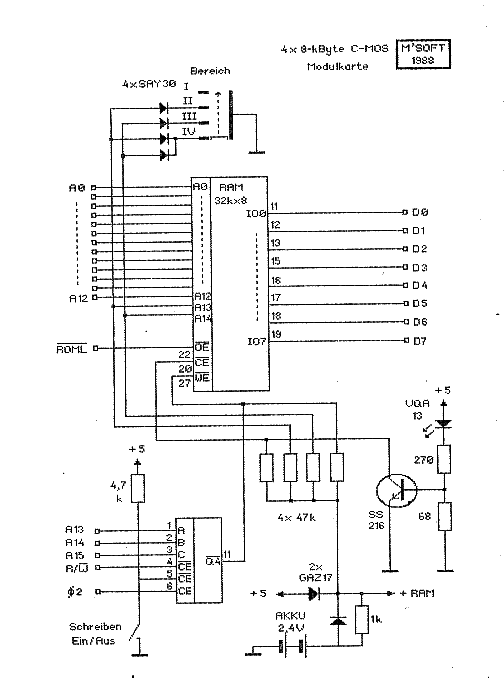 Die 16kB-CMOS-Ramkarte konnte als Modulkarte sehr schön für Drucker-Module, Fast-Loader, Turbo-Tape, Monitore verwendet werden. Es ging eben schön schnell, ein Modul-Programm auch an eigene Notwendigkeiten anpassen zu können und nicht immer schwer beschaffbare (und damals auch noch relativ empfindliche) Eproms löschen und brennen zu müssen.
